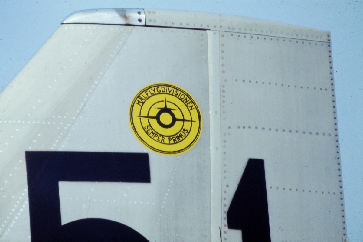 Närbild av stjärtfena med divisionsemblem för Målflygdivisionen på Malmen. På flygplan J 29 575, kod 3-51 år 1976.