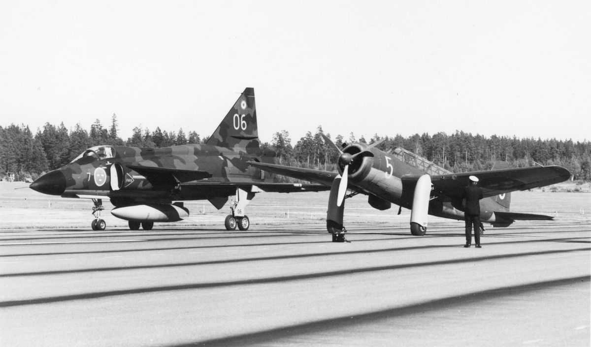 Flygplan AJ 37 märkt 7-06 från F7 Såtenäs och flygplan Saab S 17 nummer 005 står på ett flygfält.