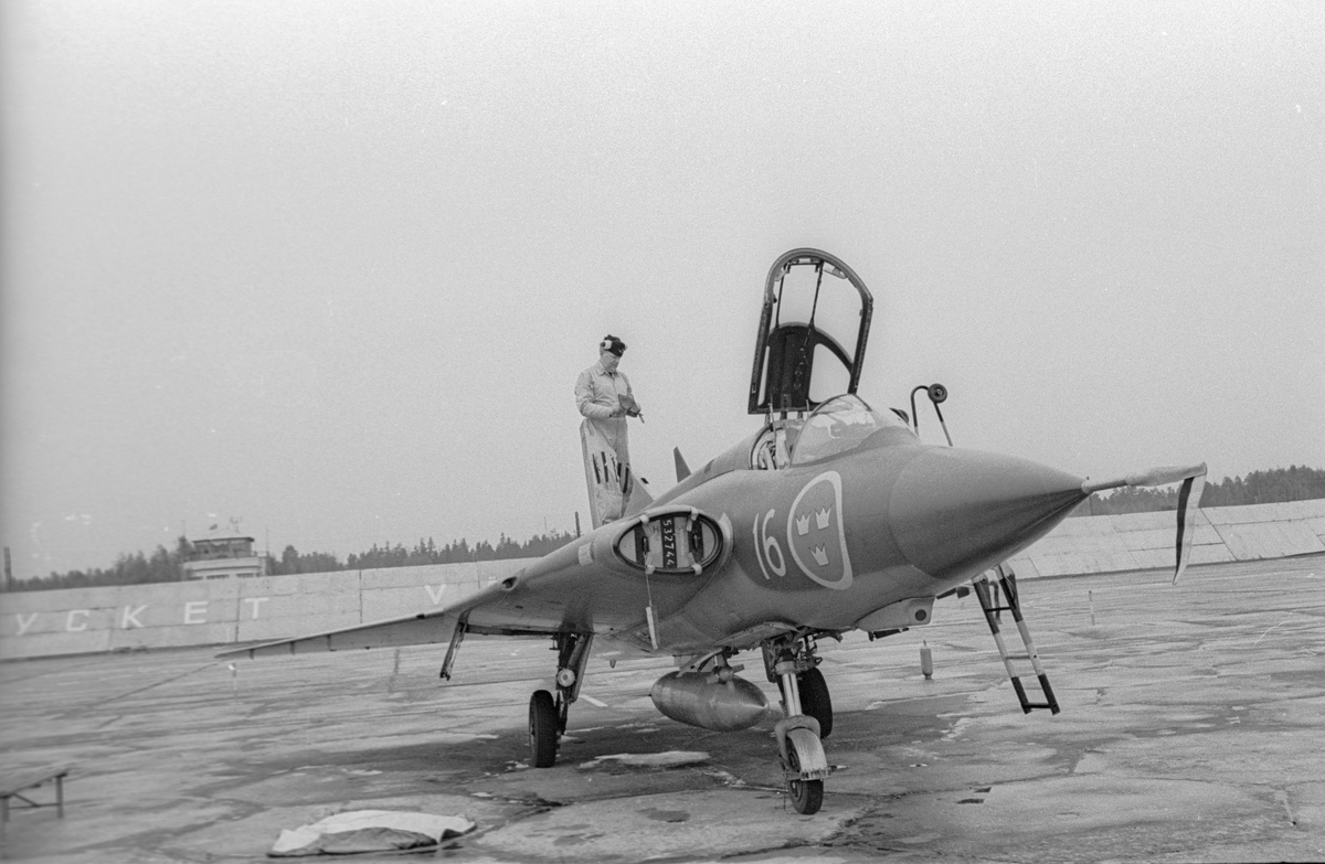 Flygplan J 35 Draken uppställd på sovjetisk flygbas. En man står på flygplanet. I bakgrunden skymtar texten 'Mycket välkomna' på en vägg. Vid Kungliga Upplands flygflottiljs besök vid sovjetisk MiG-21-bas den 16 mars 1972.