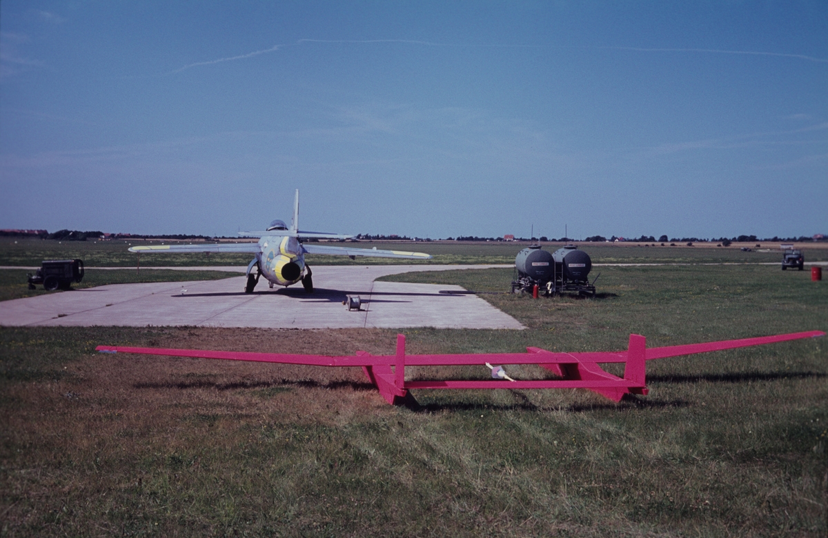 Flygplan Saab 29 ur Målflygdivisionen med bogsermål, vingmål VM 4 står på flygfältet på Malmen, ca 1967-1976.