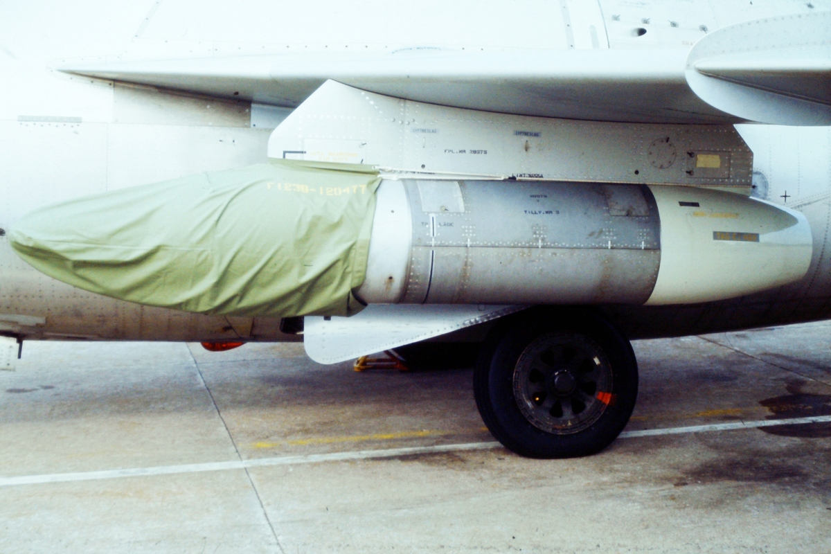 Närbild av hängande mål på målbogserarflygplan J 29 575, kod 3-51, på Malmen år 1976.