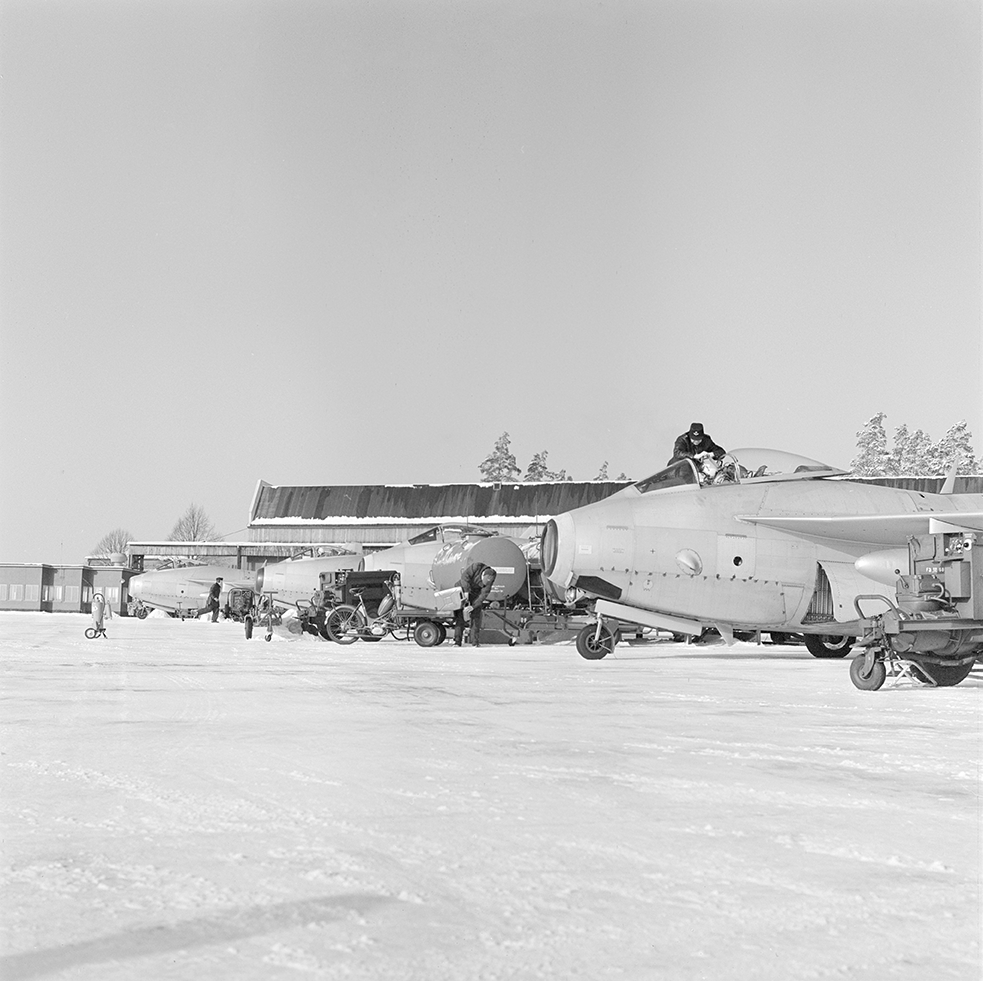 Klargöring av fyra stycken flygplan Saab 29 Tunnan vid Målflygdivisionen på F 3 Östgöta flygflottilj, vintertid.