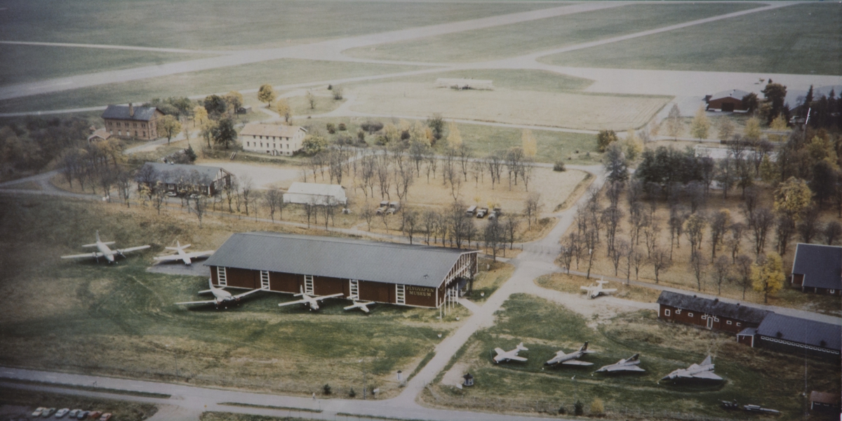 Flygfotografi av Flygvapenmuseum i Malmslätt. Museet bestående av en byggnad.