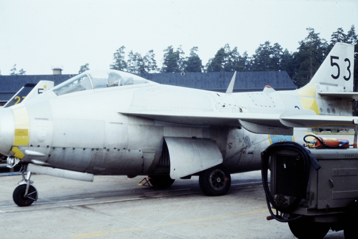 Flygplan J 29 507 som målbogserarflygplan kod 3-53 på Malmen 1976. Vy snett framifrån.