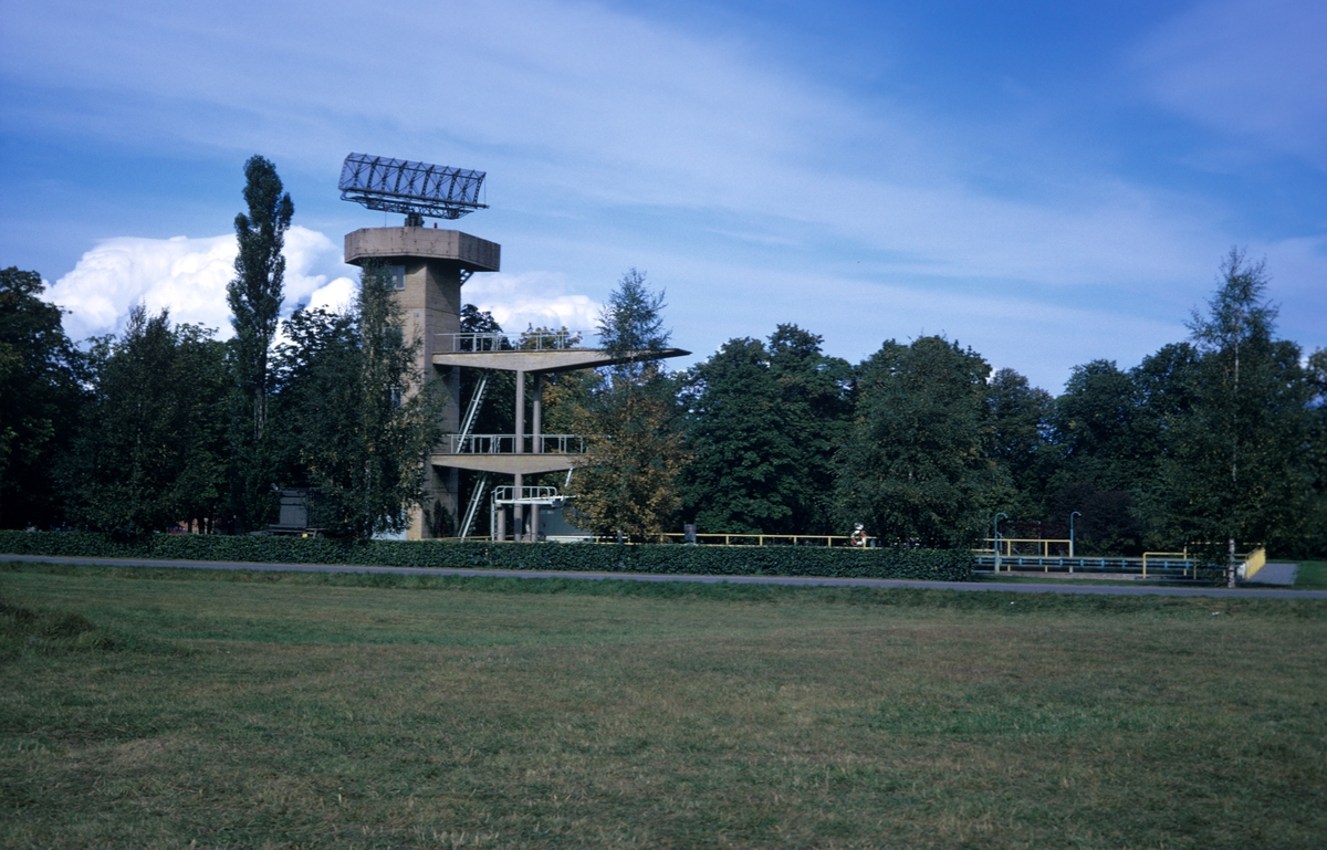 Bassäng på F 3 Östgöta flygflottilj, 1972. Med kombinerat hopp- och radartorn. På tornet står radar PS-239.