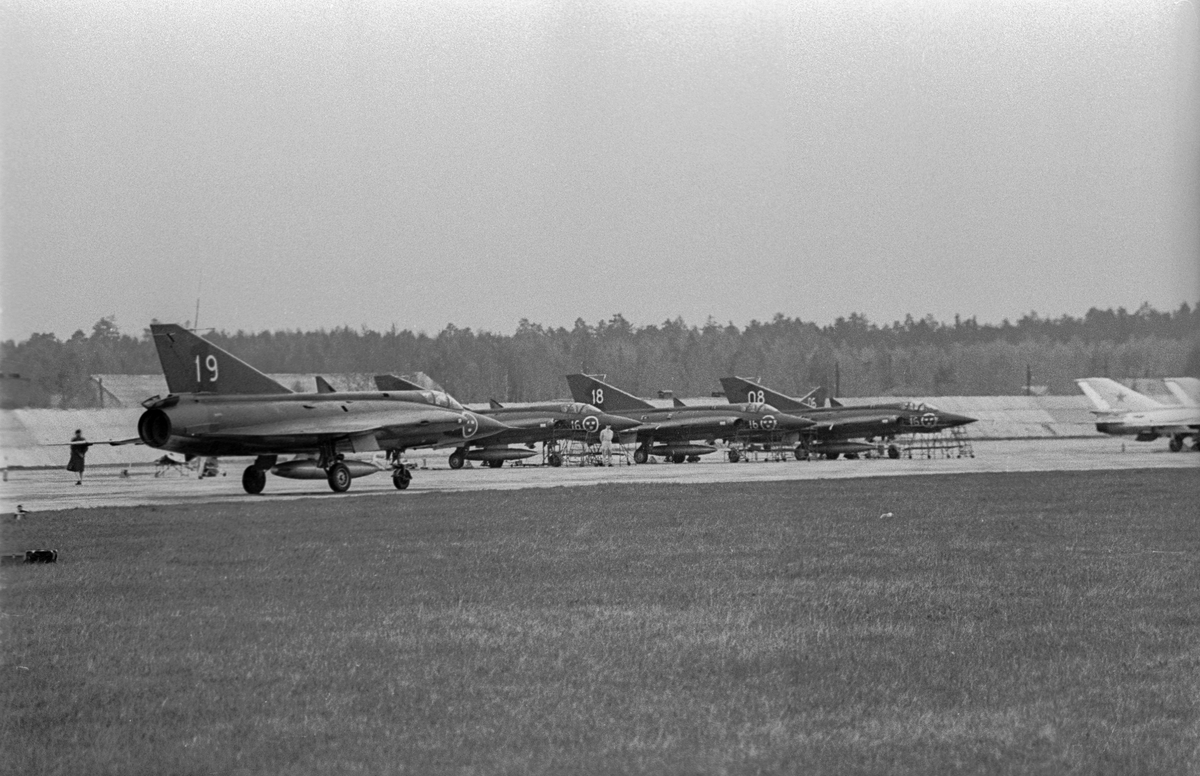 Fem flygplan J 35 Draken uppställda på landningsbana på sovjetisk flygbas. Flygplan märkt nummer 19 i förgrunden. Vid Kungliga Upplands flygflottiljs besök vid sovjetisk MiG-21-bas den 16 mars 1972.