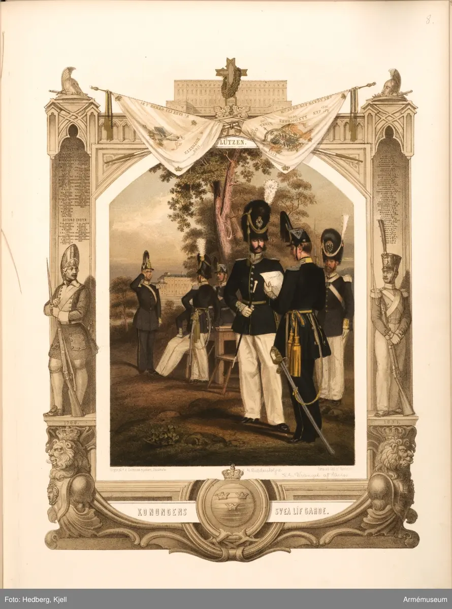 Plansch med uniform för Svea livgarde. Plansch i färgtryck efter original av Julius Mankell 1864. Ingår i planschsamlingen Anteckningar rörande svenska regementers historia.