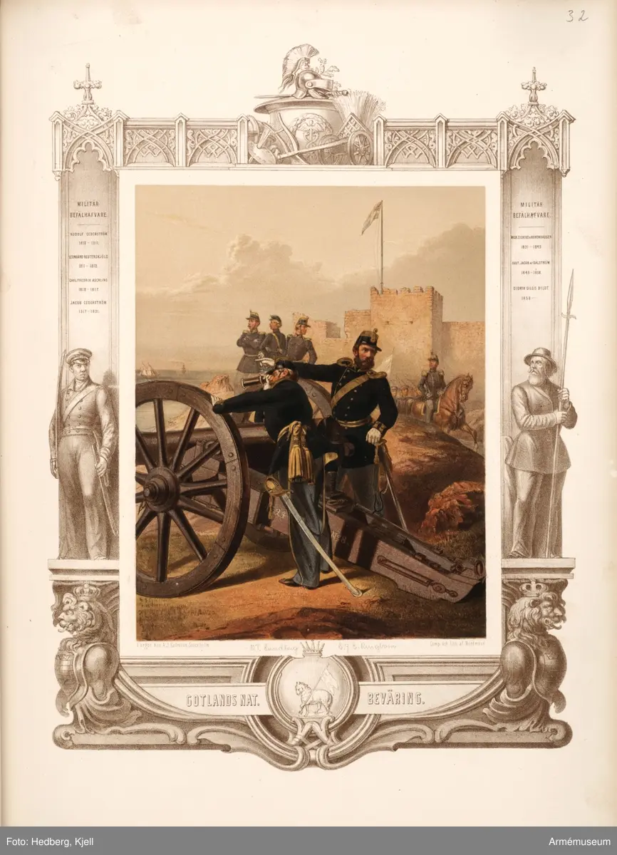 Plansch med uniform för Gotlands nationalbeväring. Plansch i färgtryck efter original av Julius Mankell 1864. Ingår i planschsamlingen Anteckningar rörande svenska regementers historia.