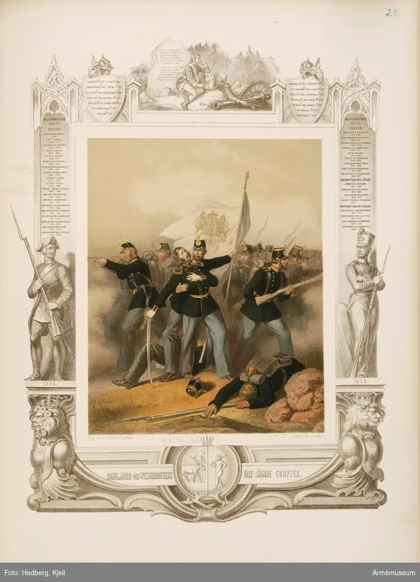 Plansch med uniform för Norrbottens fältjägarkår och Västerbottens fältjägarkår. Plansch i färgtryck efter original av Julius Mankell 1864. Ingår i planschsamlingen Anteckningar rörande svenska regementers historia.
