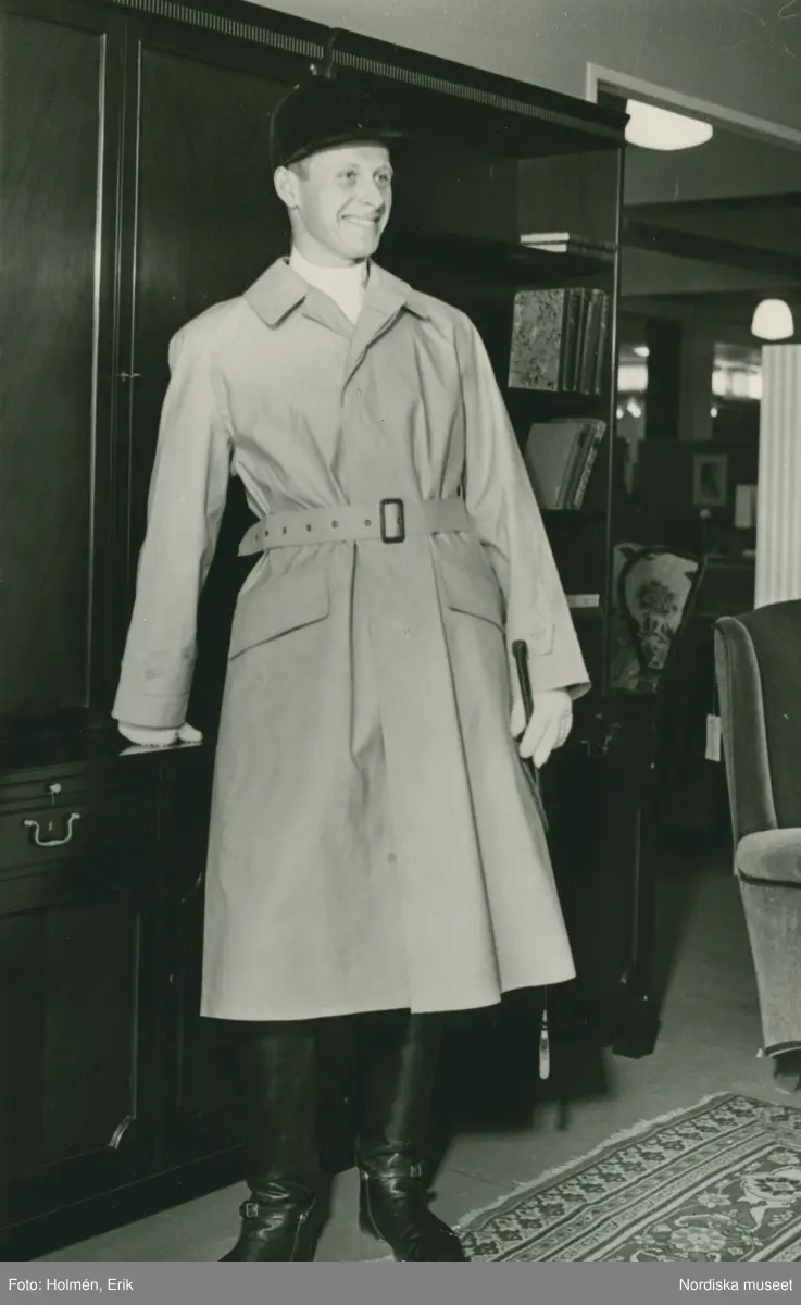 Helporträtt av en man i ridkläder framför bokhylla.