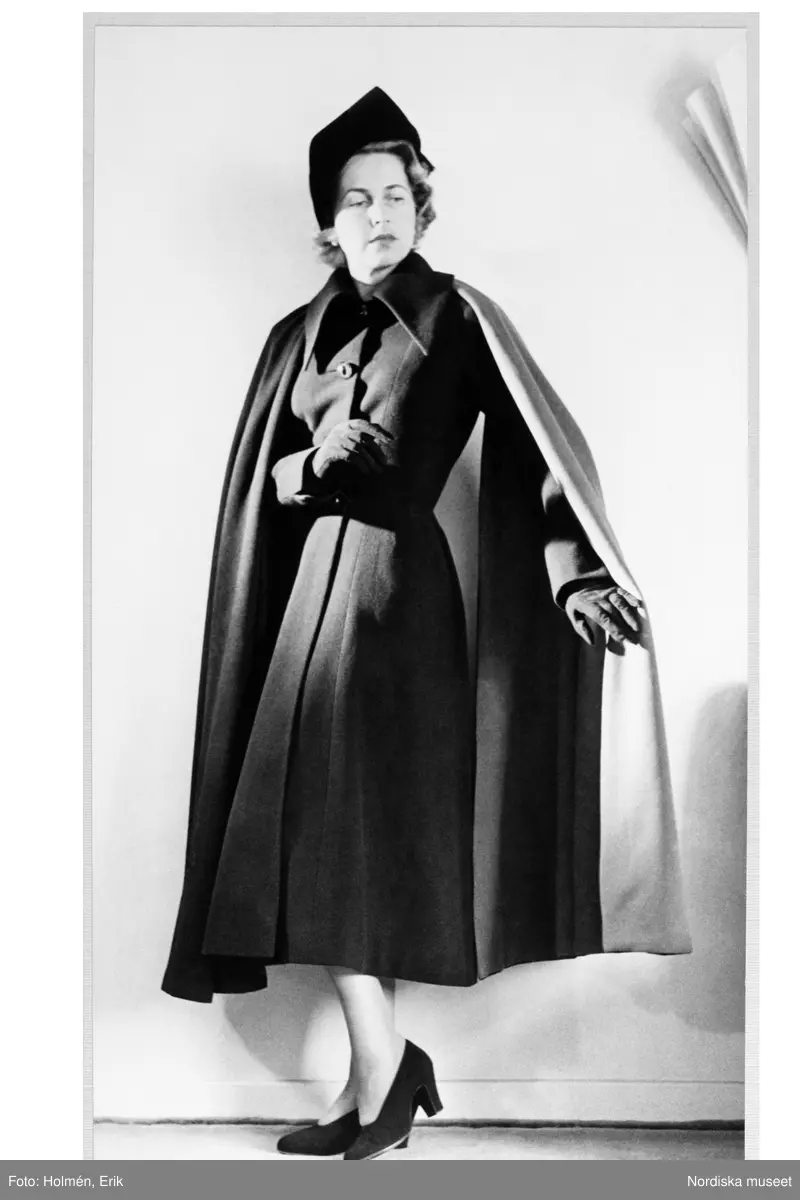 Mannekäng visar plagg i provrummet. Yllekappa, framknäppt med markerad midja och nedsydda veck, vadlång. Krage med långa snibbar. Över axlarna en cape av samma längd. Hatt, handskar och mockapumps med mellanhög klack. NK:s Franska damskrädderi.