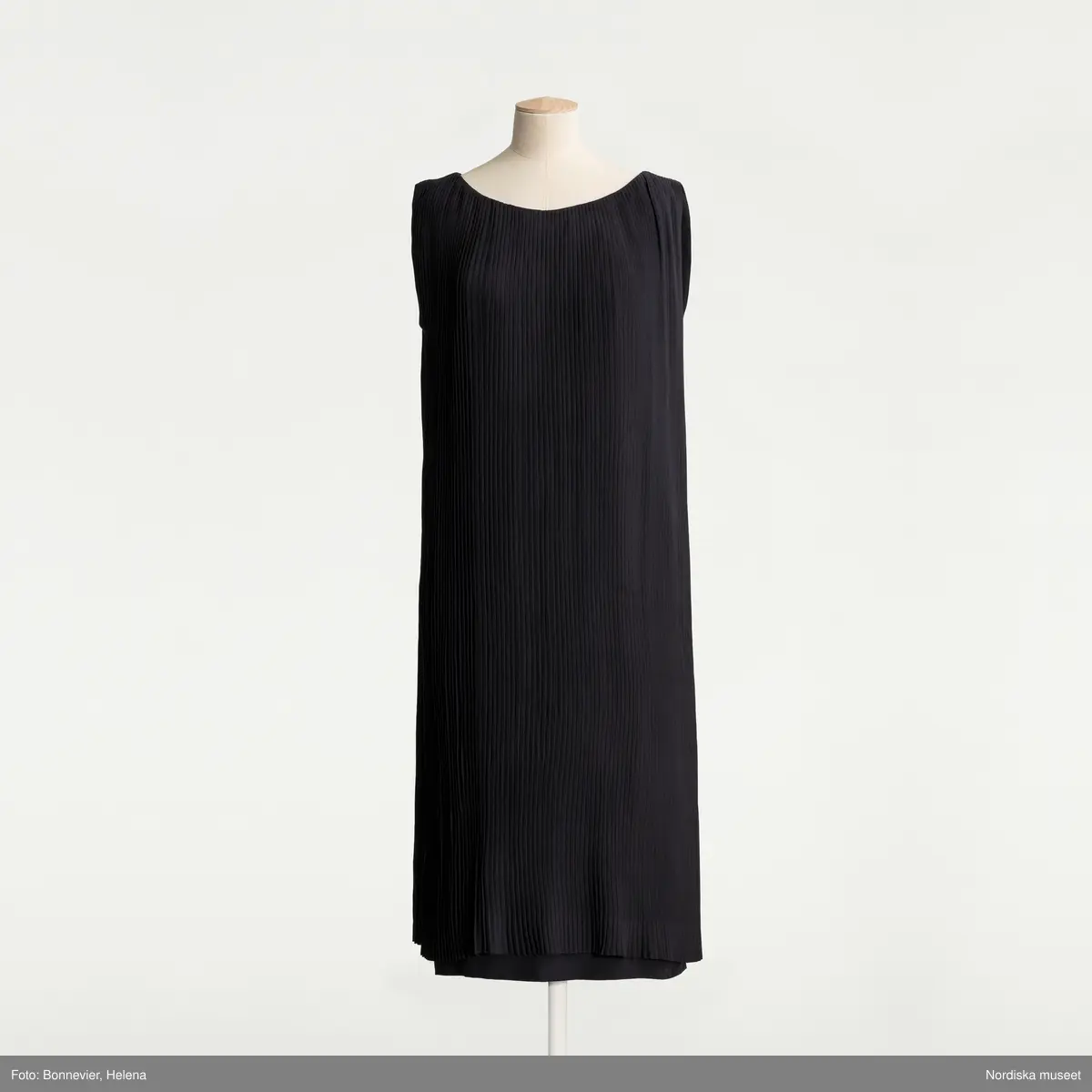 Klänning monterad på docka. Plisserad tunikaklänning uppsydd på NK:s Franska damskrädderi efter ett original från Cristóbal Balenciaga. Beställd av grevinnan Hamilton, levererad i september 1961.