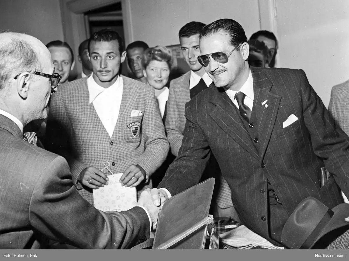 Det brasilianska fotbollslaget Flamengo på Nordiska Kompaniet. Två män tar i hand.