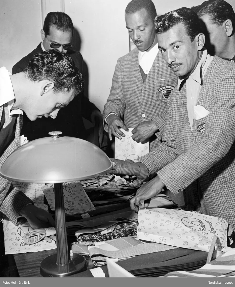 Det brasilianska fotbollslaget Flamengo på Nordiska Kompaniet. Män lägger slipsar i påsar.