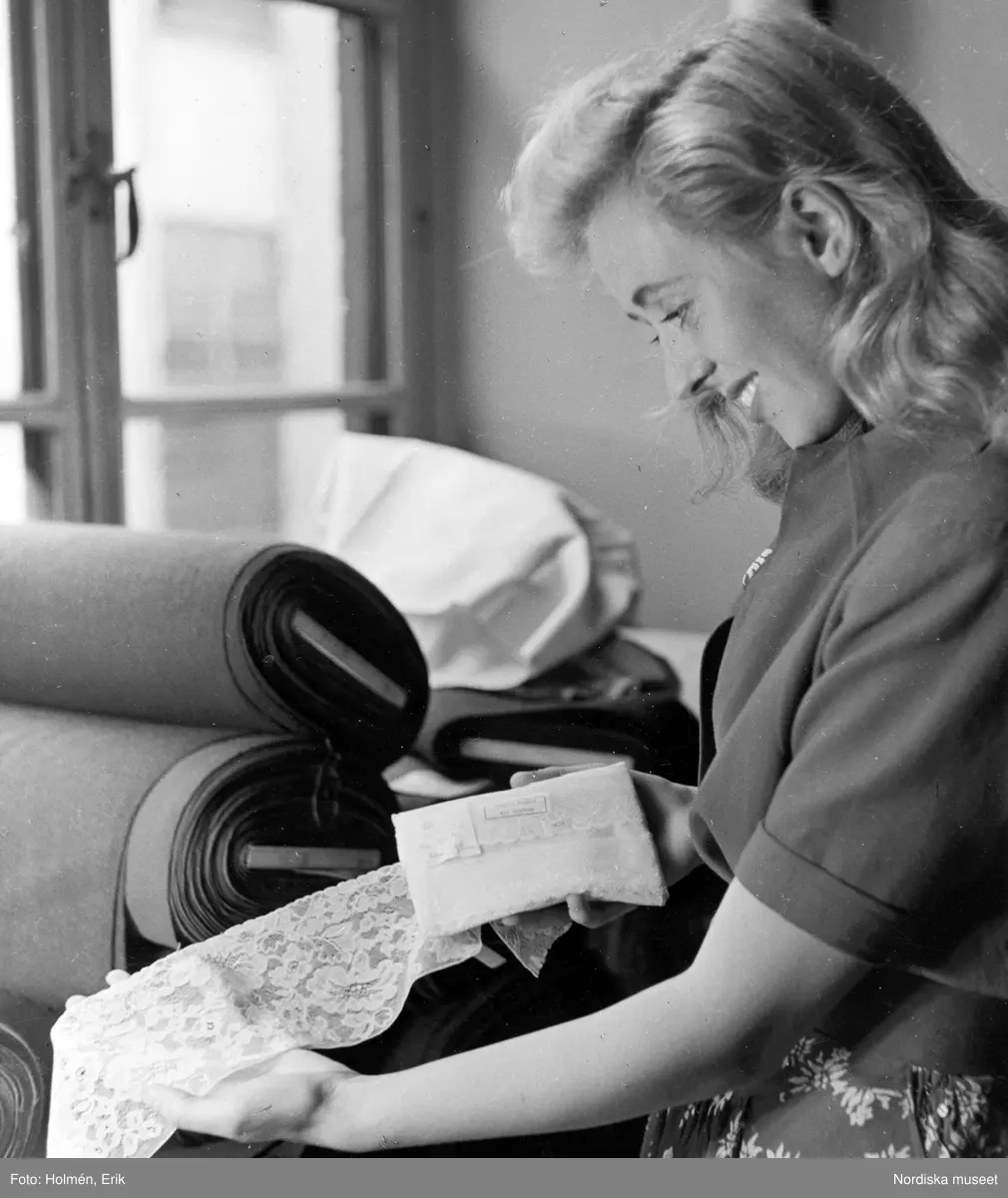 Kvinna tittar på spets på Nordiska Kompaniet.