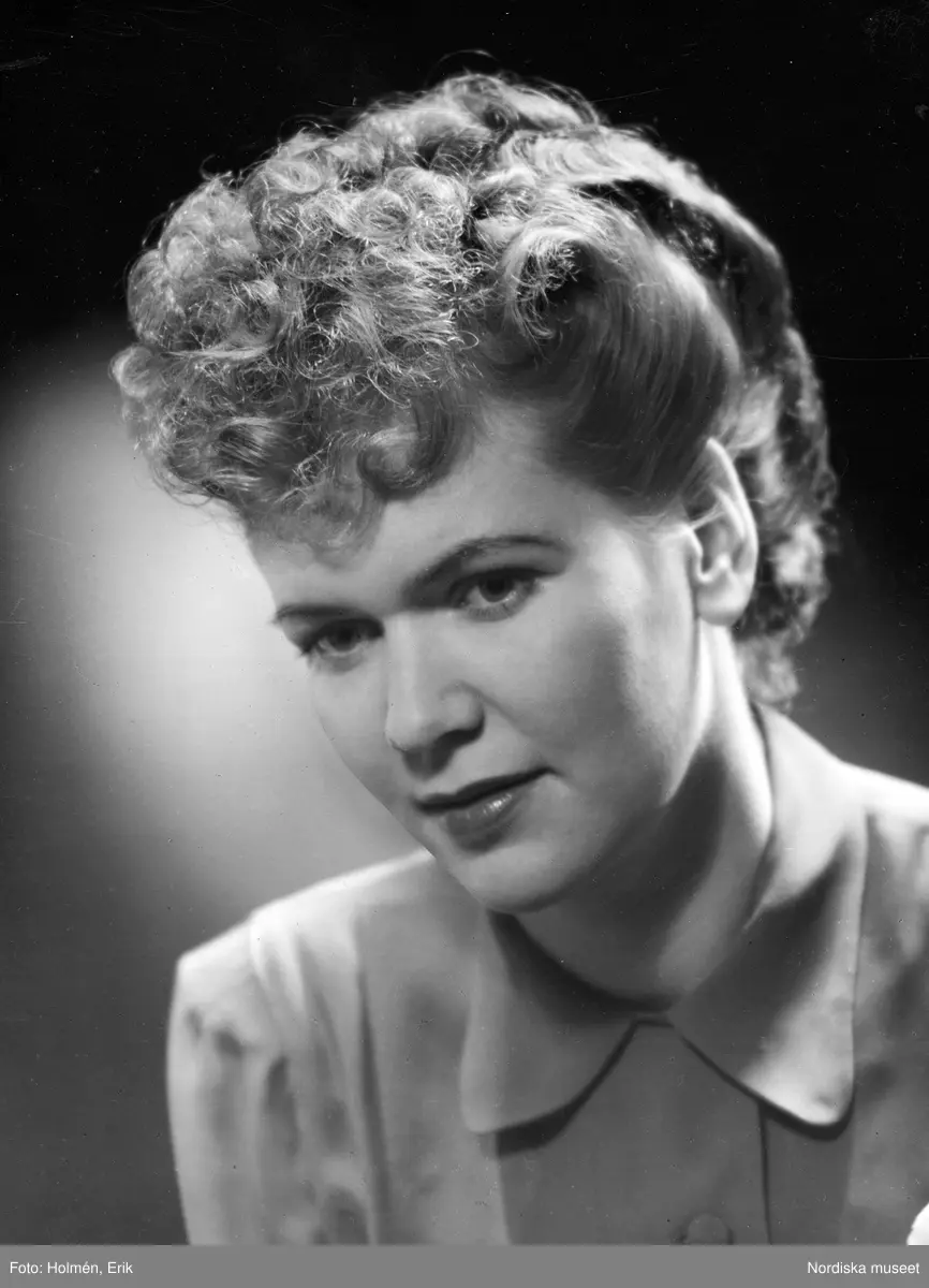 Kvinna i lagd frisyr och blus.