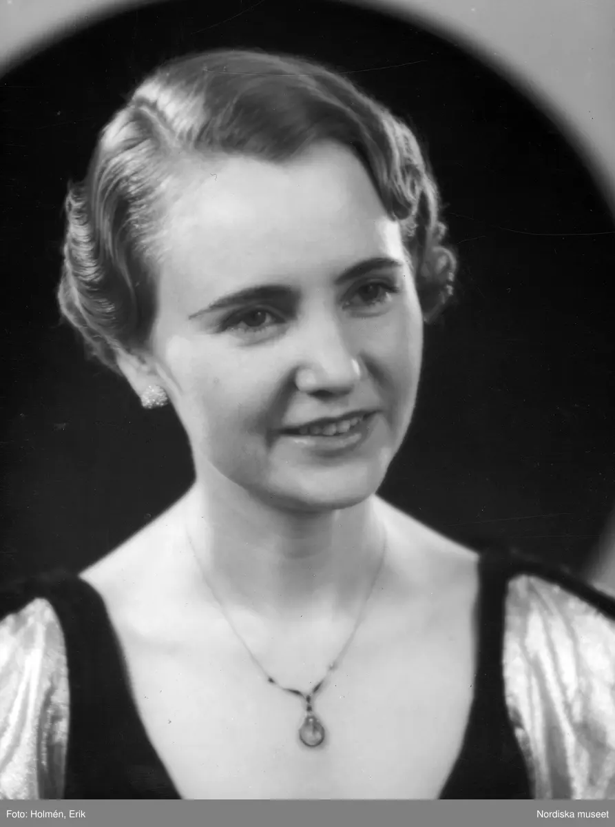 Fru M. Oldenburg i lagd frisyr, örhänge och halsband.