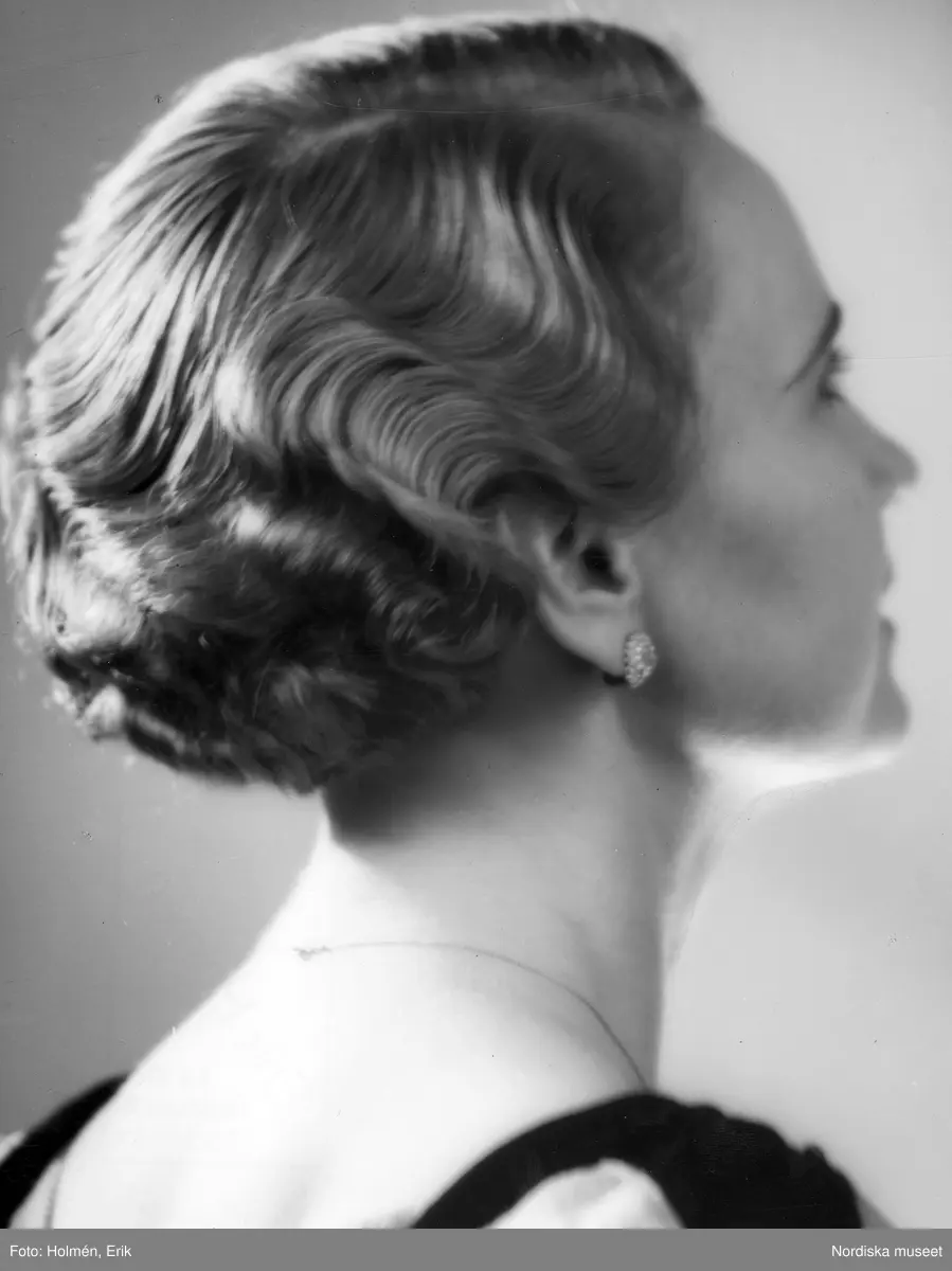 Fru M. Oldenburg i lagd frisyr, örhänge och halsband.