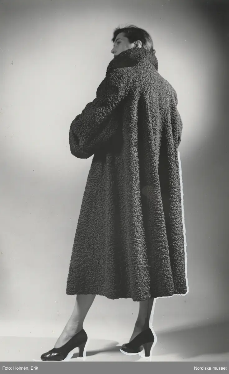 Nordiska Kompaniet. Kvinna i mörk päls med uppfälld kjrage och mjuka veck i ryggen. Text på baksidan: "1951"