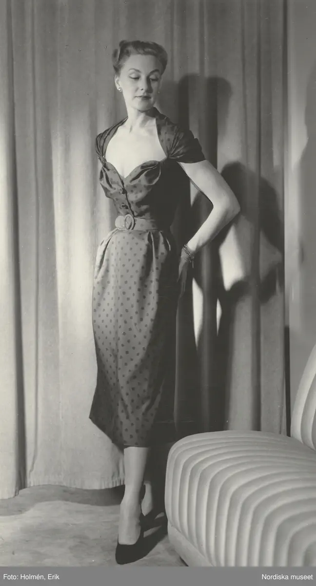 Modell i prickig klänning med skärp, handskar och örhängen.