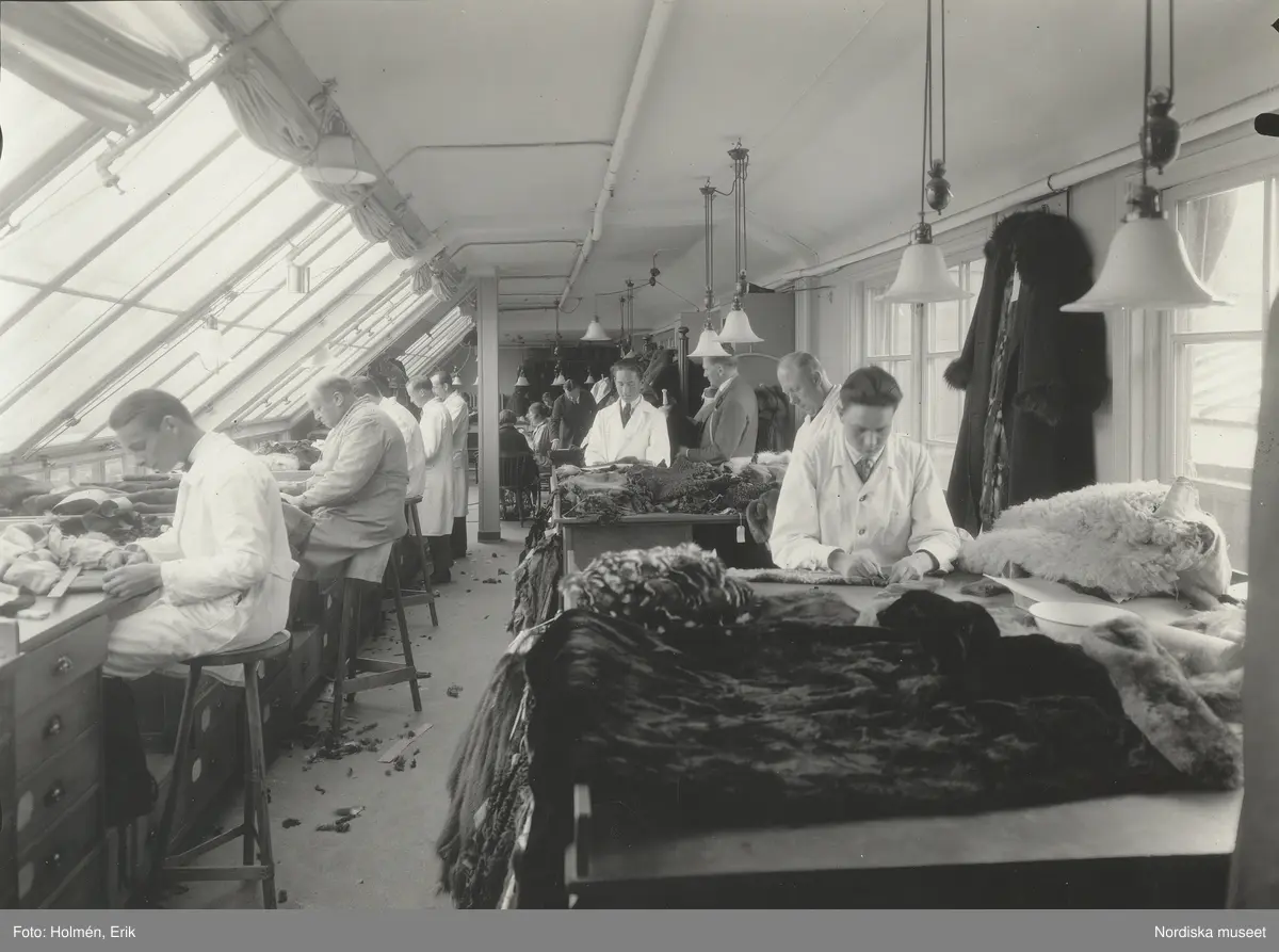 I pälsateljén på Nordiska Kompaniet. Män i vita arbetsrockar arbetar med pälsar.