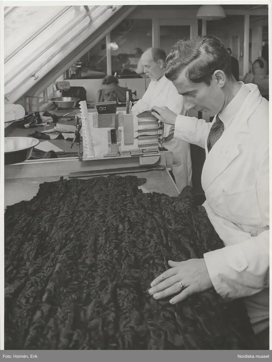 Man i vit arbetsrock vid verktygstället i pälsateljén.