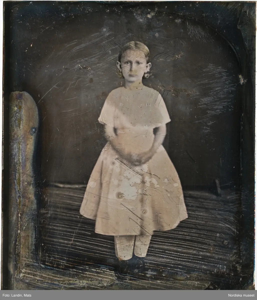 Porträtt i helfigur av flicka. Stående, fas, iklädd ljus kortärmad, enkel klänning, vita mamelucker och svarta kängor. Dagerrotyp / daguerreotyp, oramad, enligt uppgift från omkr. 1850, Örebro. Plåten stämplad "V O Z". Nordiska museet inv.nr 160155