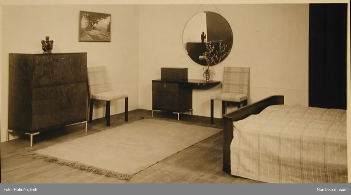 Möbelutställning på Nordiska Kompaniet, "Arkitekt Hjorts utställning våren 1933". Sovrumsmöblemang modell "Record" formgivet av Axel Einar Hjort.