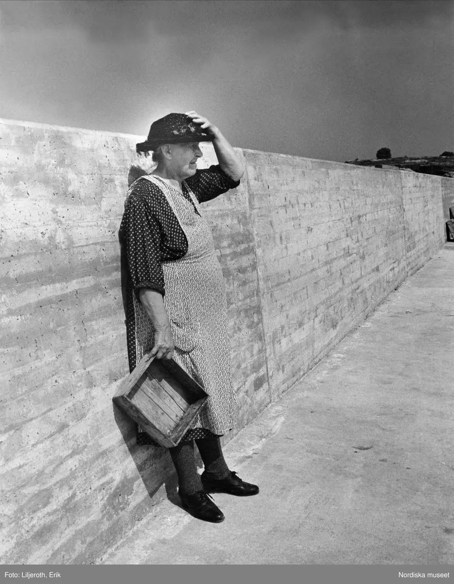 En äldre kvinna med en trälåda i handen står lutad mot en mur vid Herrviks fiskehamn, Gotland