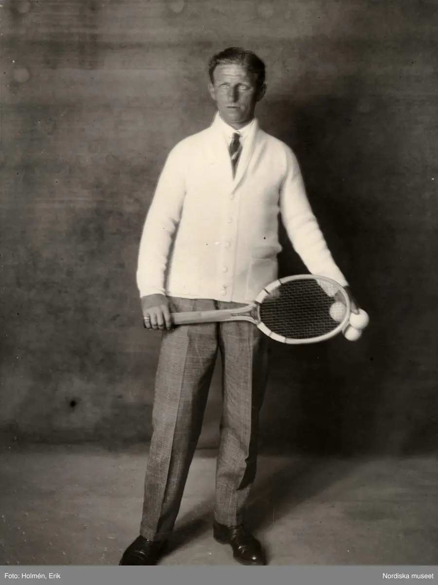 "Nordiska Kompaniets tennisvecka". Tennisspelaren Josef Kozeluk iklädd kofta, långbyxor, skjorta och slips, med racket och bollar.