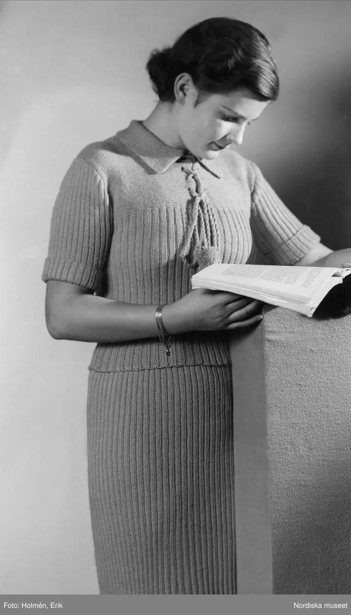 Kvinnlig modell visar en stickad dräkt. Nordiska Kompaniet.