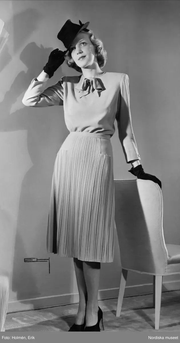 Modell visar en plisserad klänning. Nordiska Kompaniet.