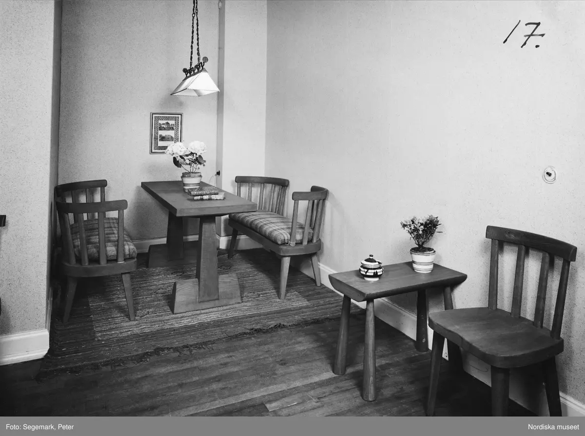 Vardagsrum, interiör, två bord, två kökssoffor och en stol. Nordiska kompaniet.