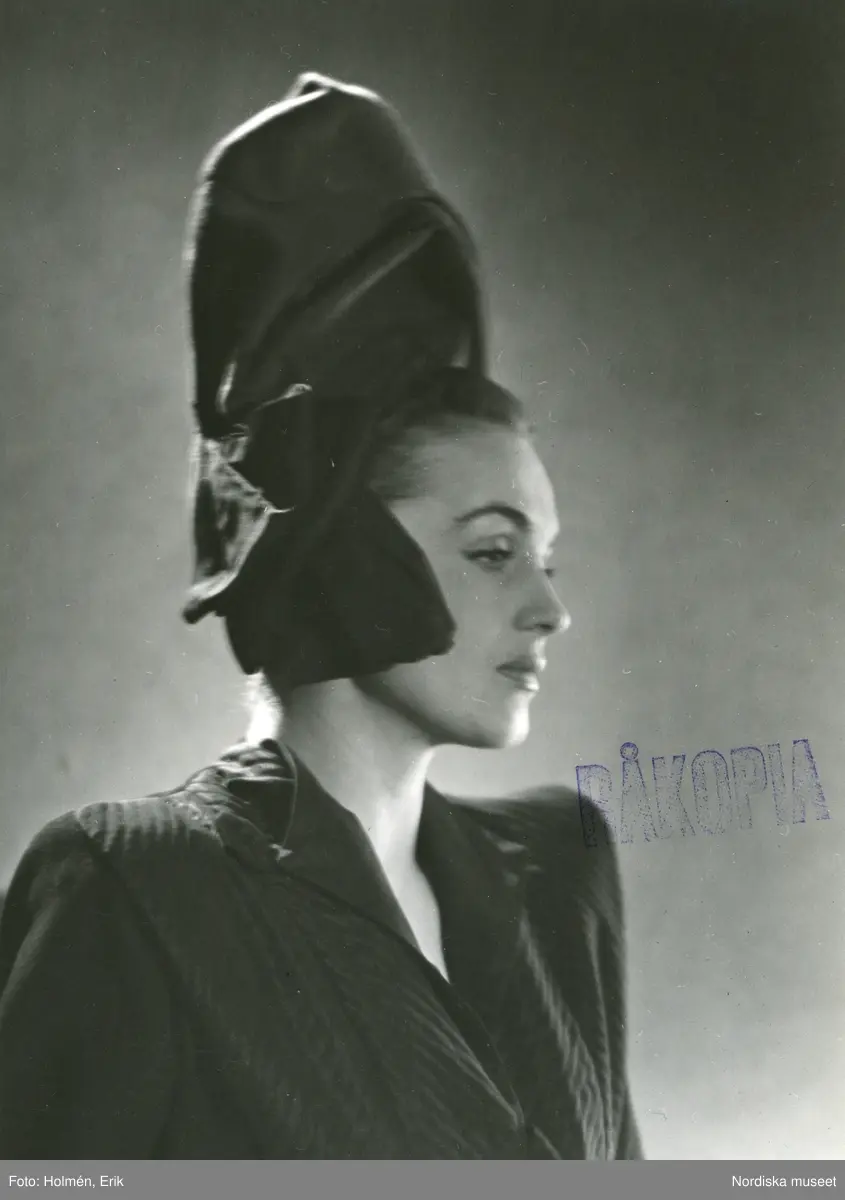 Porträtt av kvinna i hög hatt och mörk överdel med axelvaddar.