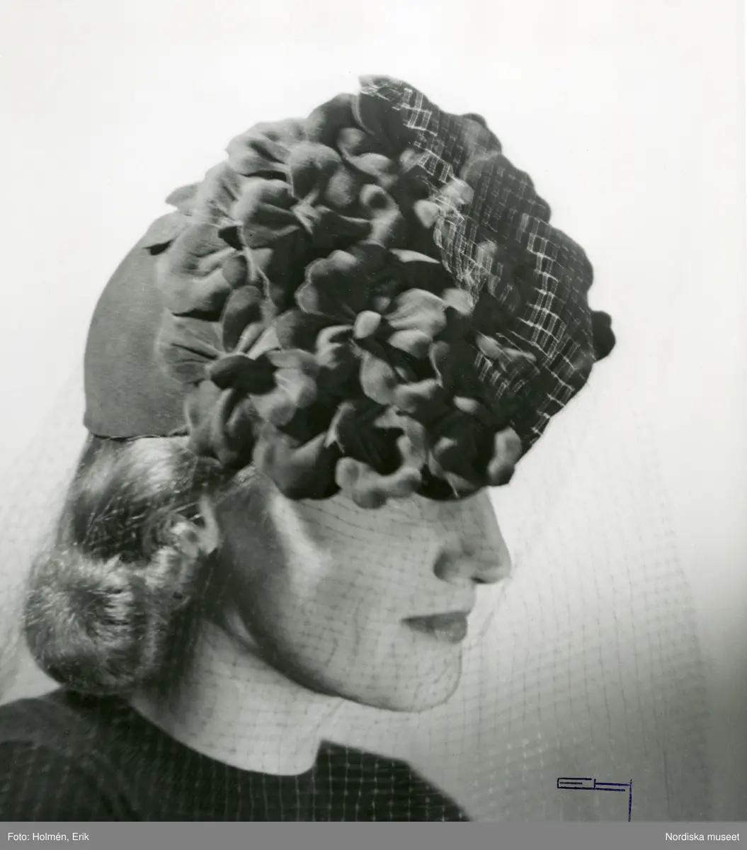 Porträtt av kvinna i hatt med långt flor och blomsterdekoration av Rose Descat.