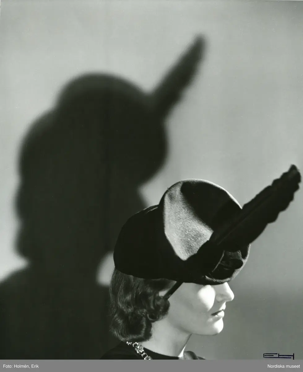 Porträtt av kvinna i hatt med fjäderpenna av Blanche and Simone.
