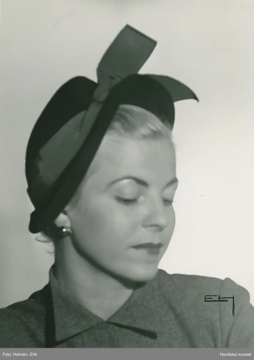 Porträtt av kvinna i buteljgrön velourhatt med brun garnering av Claude St Cyr, Paris.