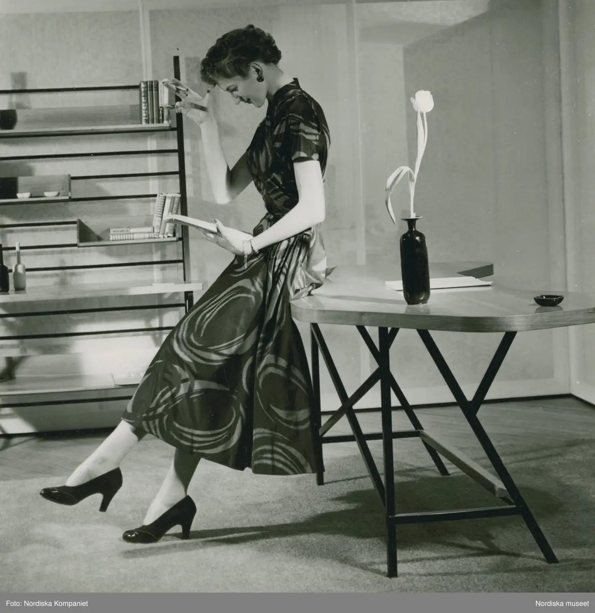 Modell i mönstrad klänning, örhänge, armband och pumps, läser i en bok, lutad mot ett bord. "Italiana".