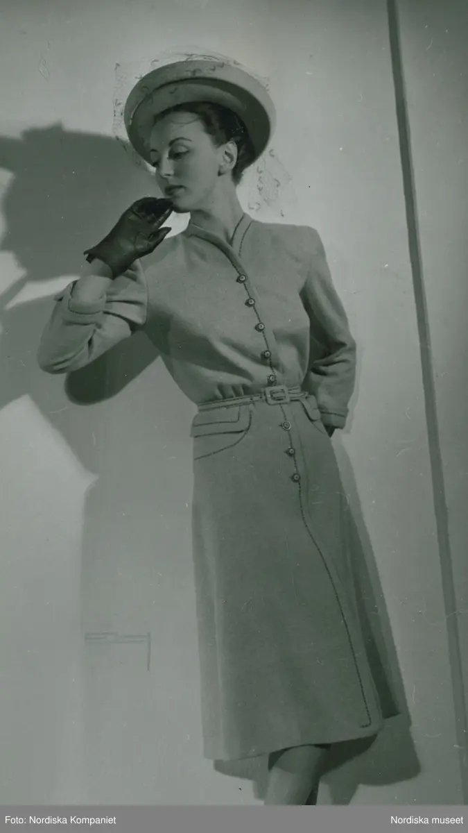 Modell, möjligen Hjördis Grundel-Starenius, i kappa, hatt med flor och handskar, från Edward Molyneux.