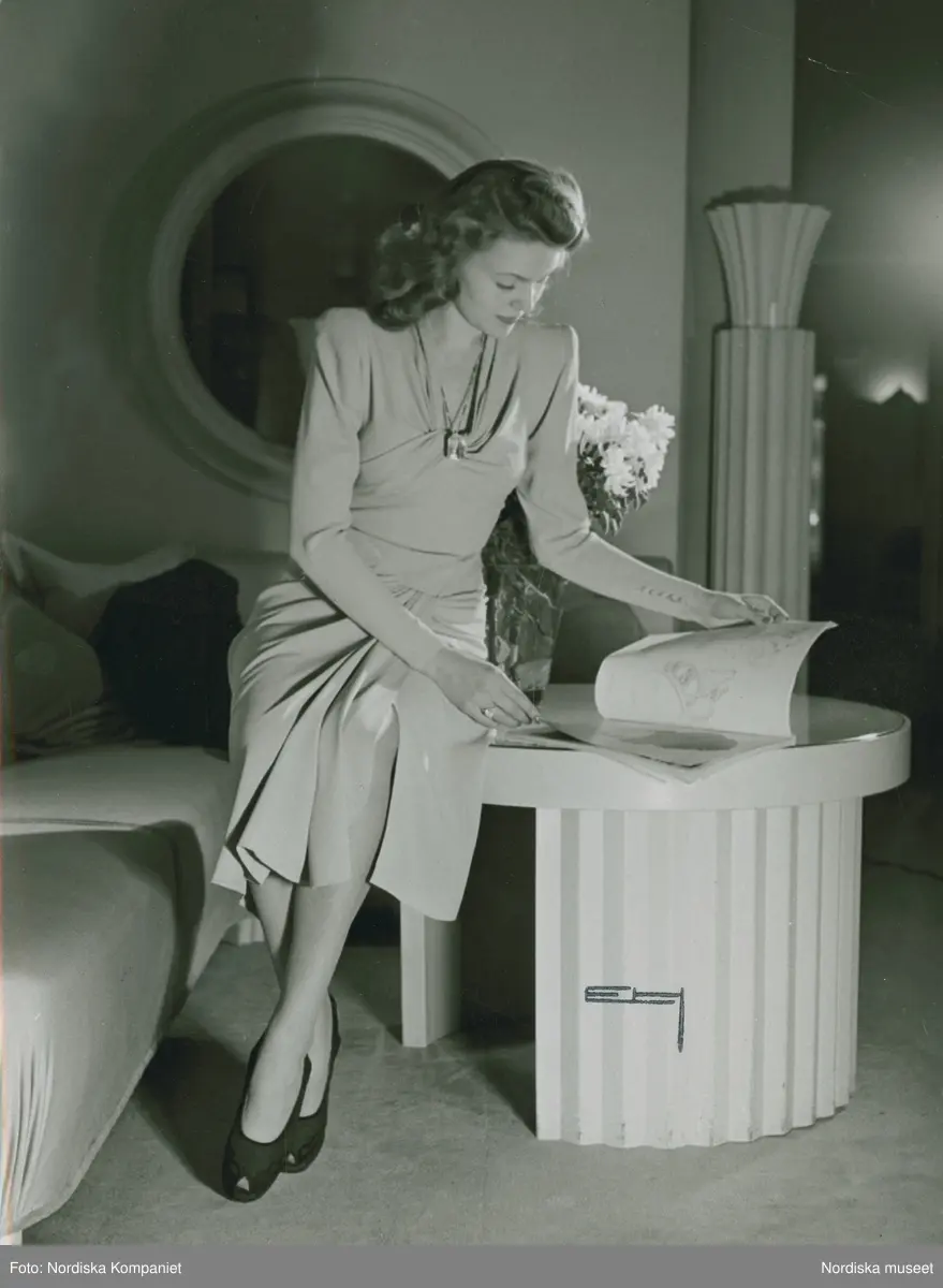 Modell i klänning med draperade detaljer, halsband och ringar och skor med öppen tå, sitter på ett bord och bläddrar i en bok.