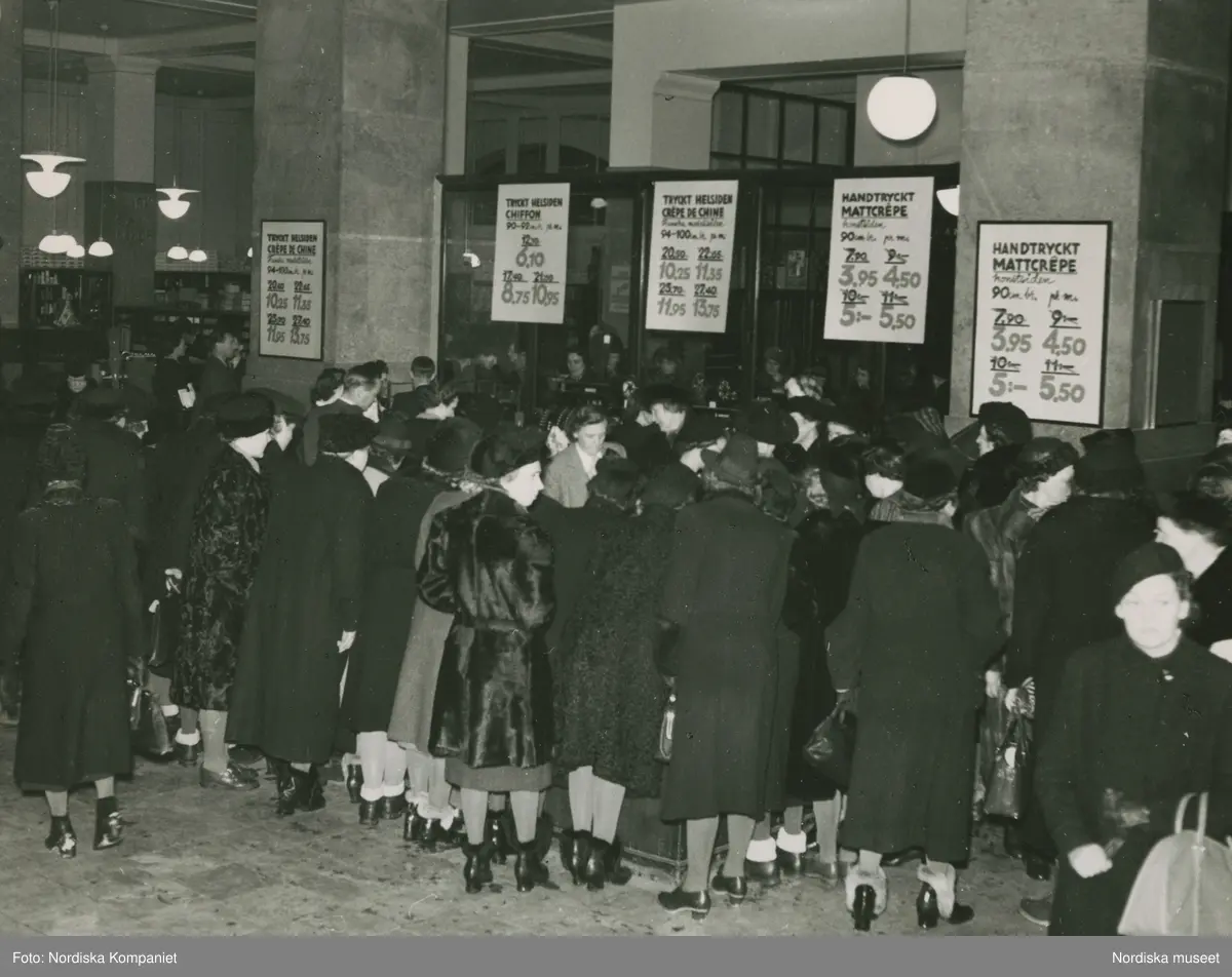 Realisation på Nordiska kompaniet. Trängsel kring varustånd med tyger. Text med blyerts på baksidan: Realisation (bild utan årtal).
