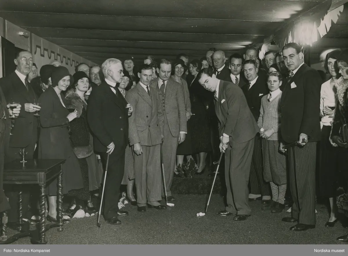 Golfspelande herrar inomhus. I bakgrunden en folksamling som ser på. Nordiska Kompaniet. Text med blyerts på baksidan: "Golfbanan jan 1931 DF Sport Golf."