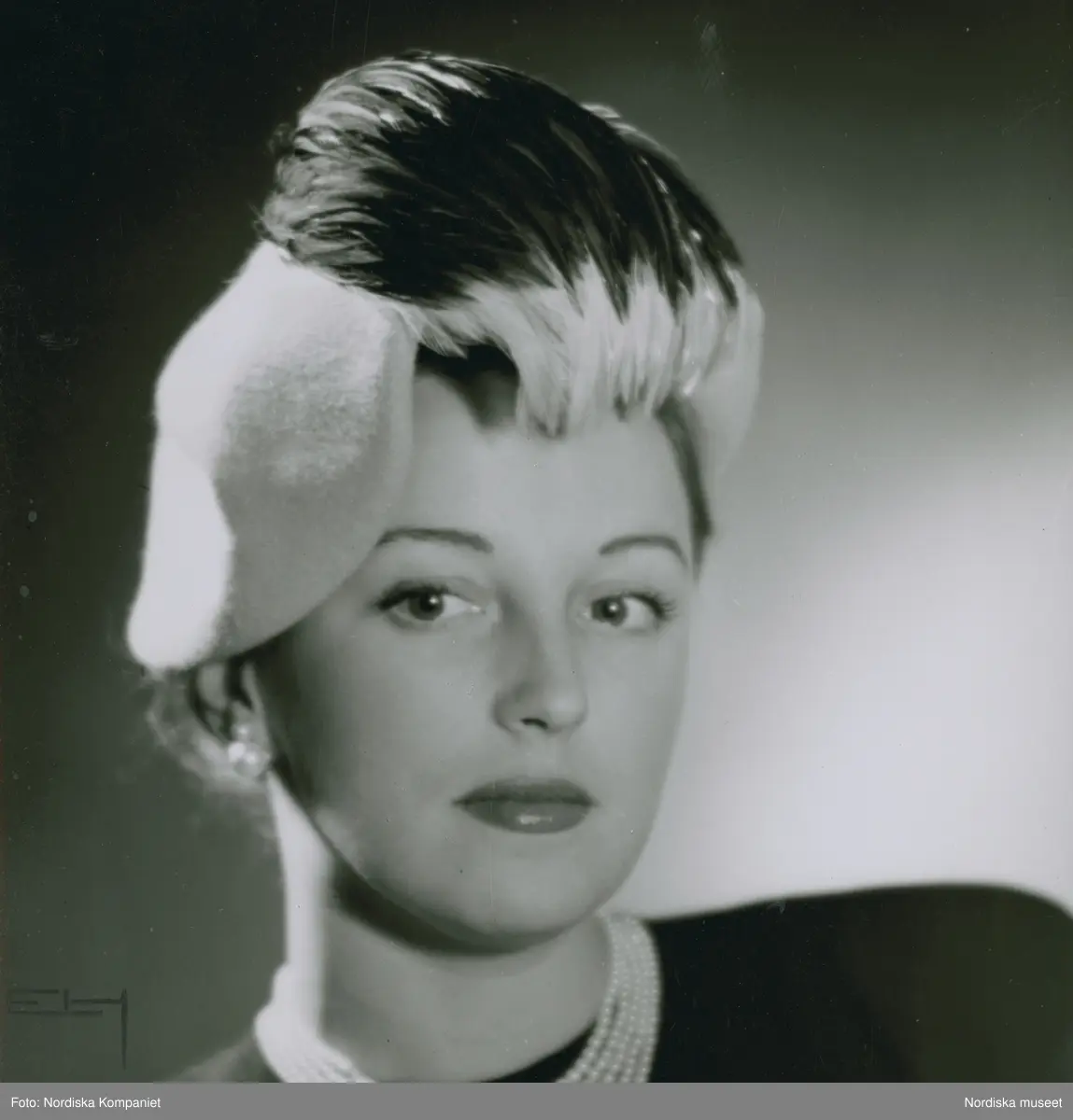 Porträtt av modell i gul filthatt med fantasi och flerradigt pärlhalsband. Från Madame Paulette.