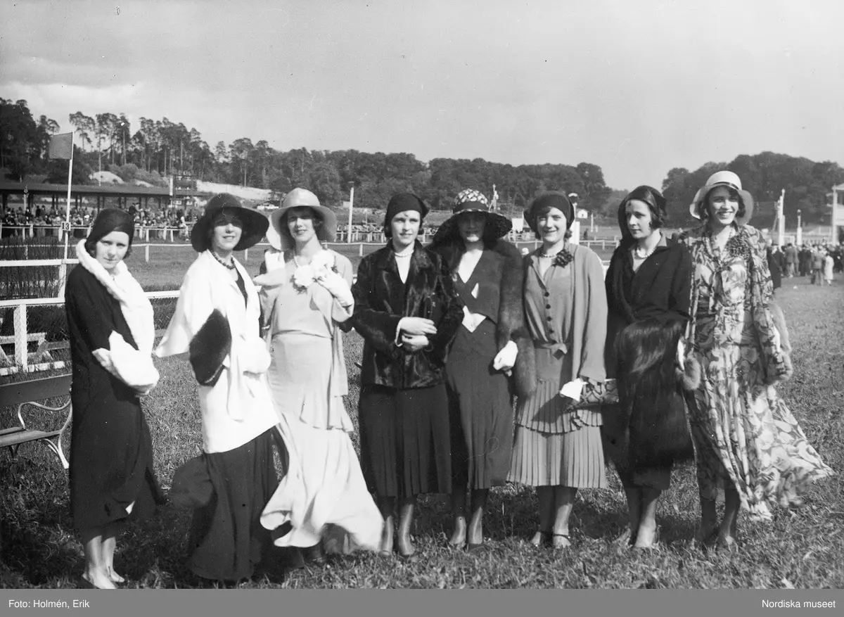 Kvinnor på rad på kapplöpningsbana. Klädda i hattar, klänningar, kappor med pälsdetaljer, smycken och handväskor.