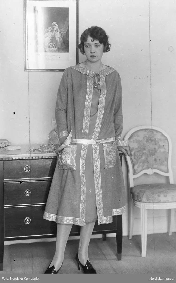 Modell poserar vid byrå, i ärtgrön klänning med breda silkesbårder. Från Lanvin.