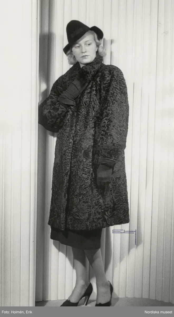 Nordiska Kompaniet. Kvinna i knälång pälskappa och svart hatt. Påskrift på baksidan: "Pälsar 30-talet"
