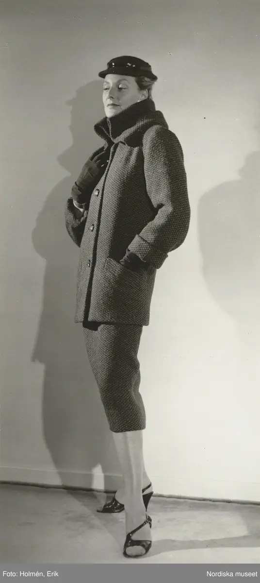 Modell i jacka, kjol, hatt och handskar. NK efter Dior.