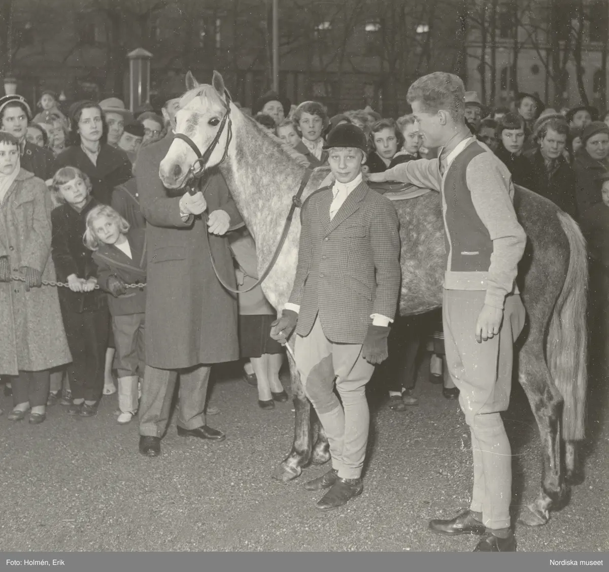 Folksamling kring en häst och en ryttare. Tonårsmodevisning i Kungsträdgården.