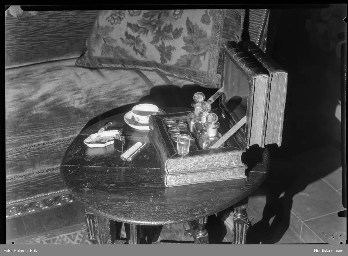 Ett litet "barskåp" i form av fyra böcker stapade på varandra, står öppet på ett sidobord intill en soffa.