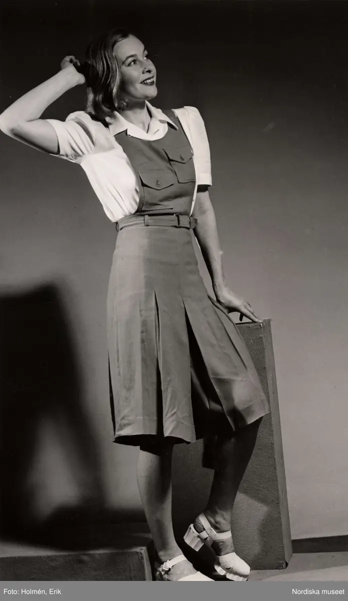 Sommarklädsel visas på Nordiska Kompaniet 1943. Kvinnlig modell poserar i hängselkjol (byxkjol) och kortärmad blus.
